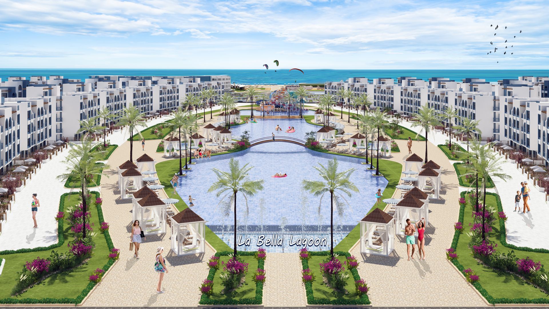Located in Marsa Matruh, La Bella Lagoon Village offers a luxurious beachfront experience with its soft white sand and turquoise waters. The project extends over an area of 57.5 acres, with 20% allocated to construction and 80% to green spaces, swimming pools, and services. All units have a direct view of the sea, creating a quiet and distinctive living environment